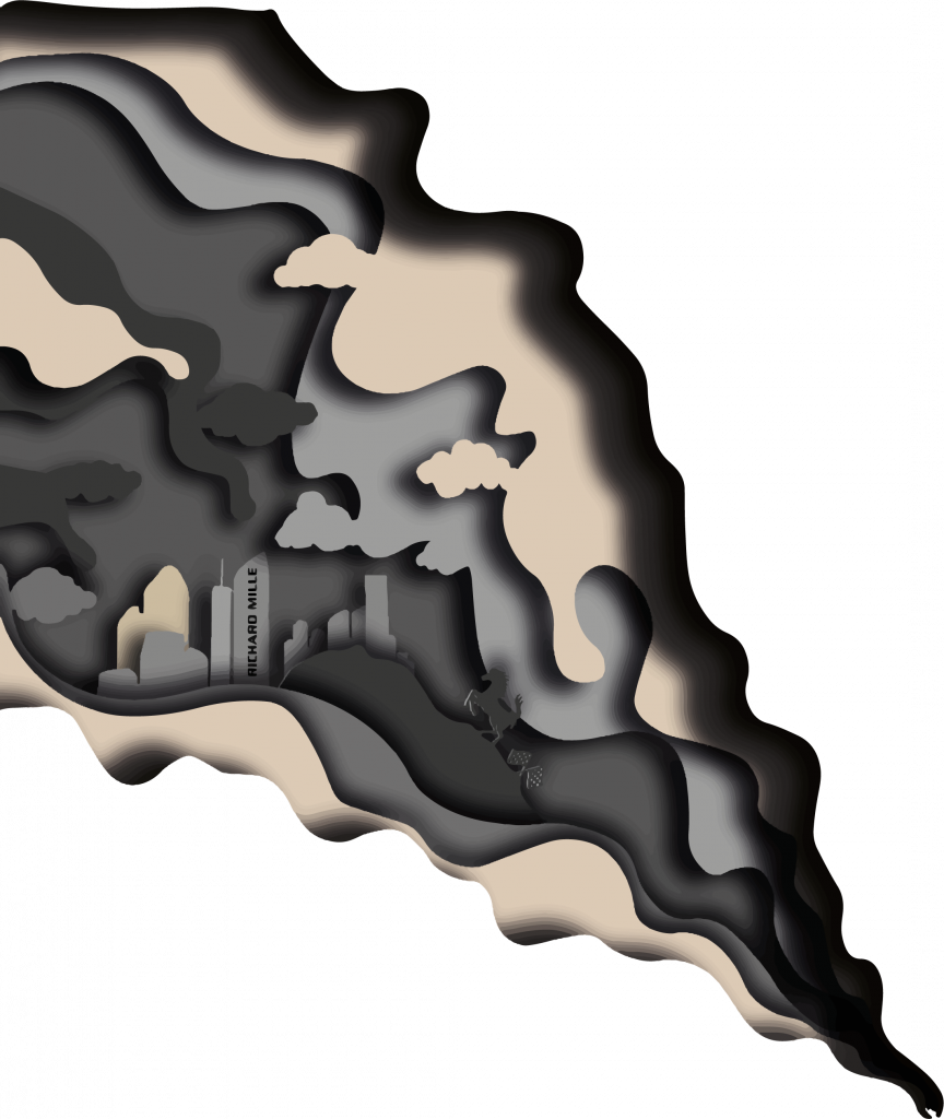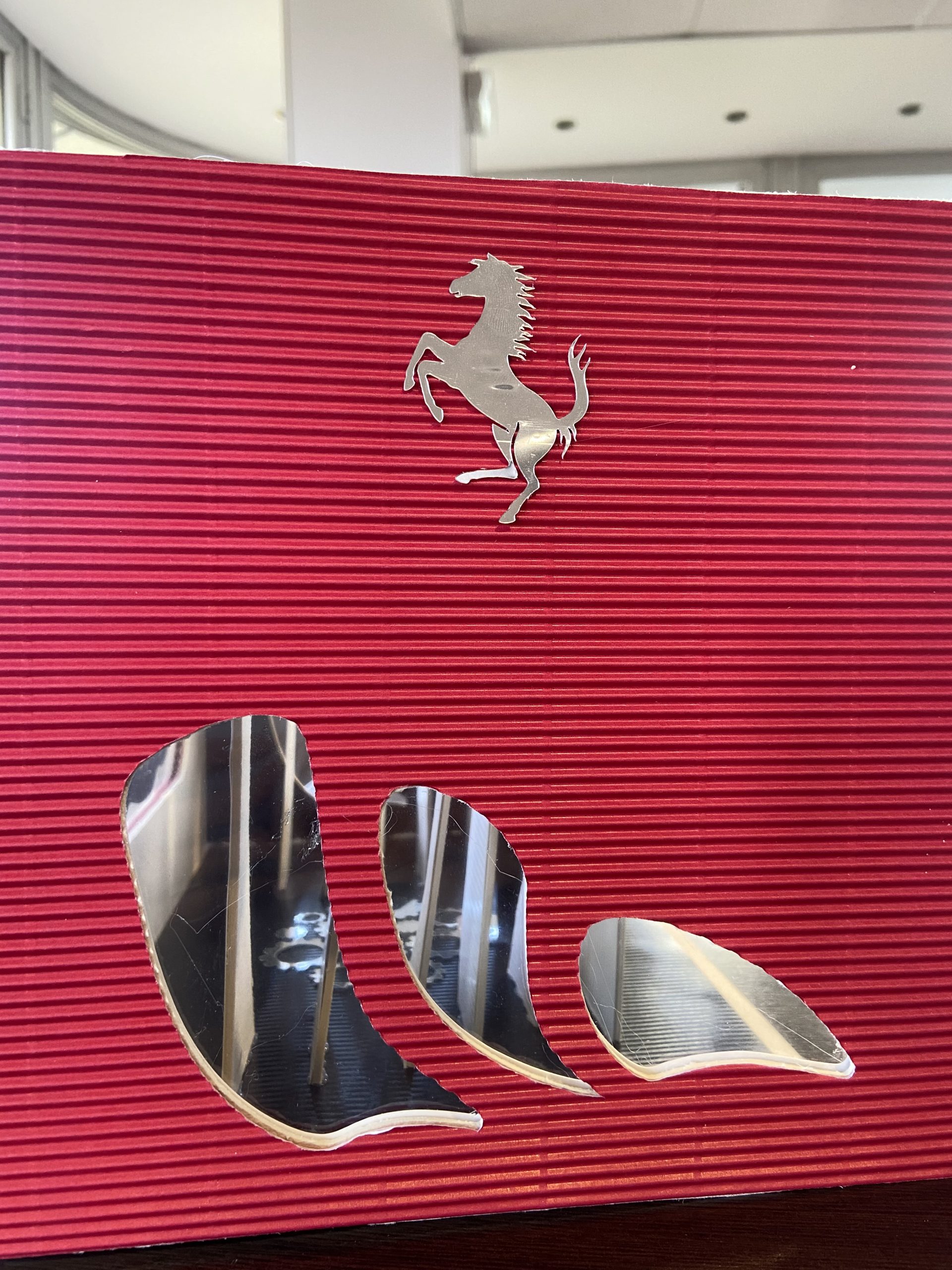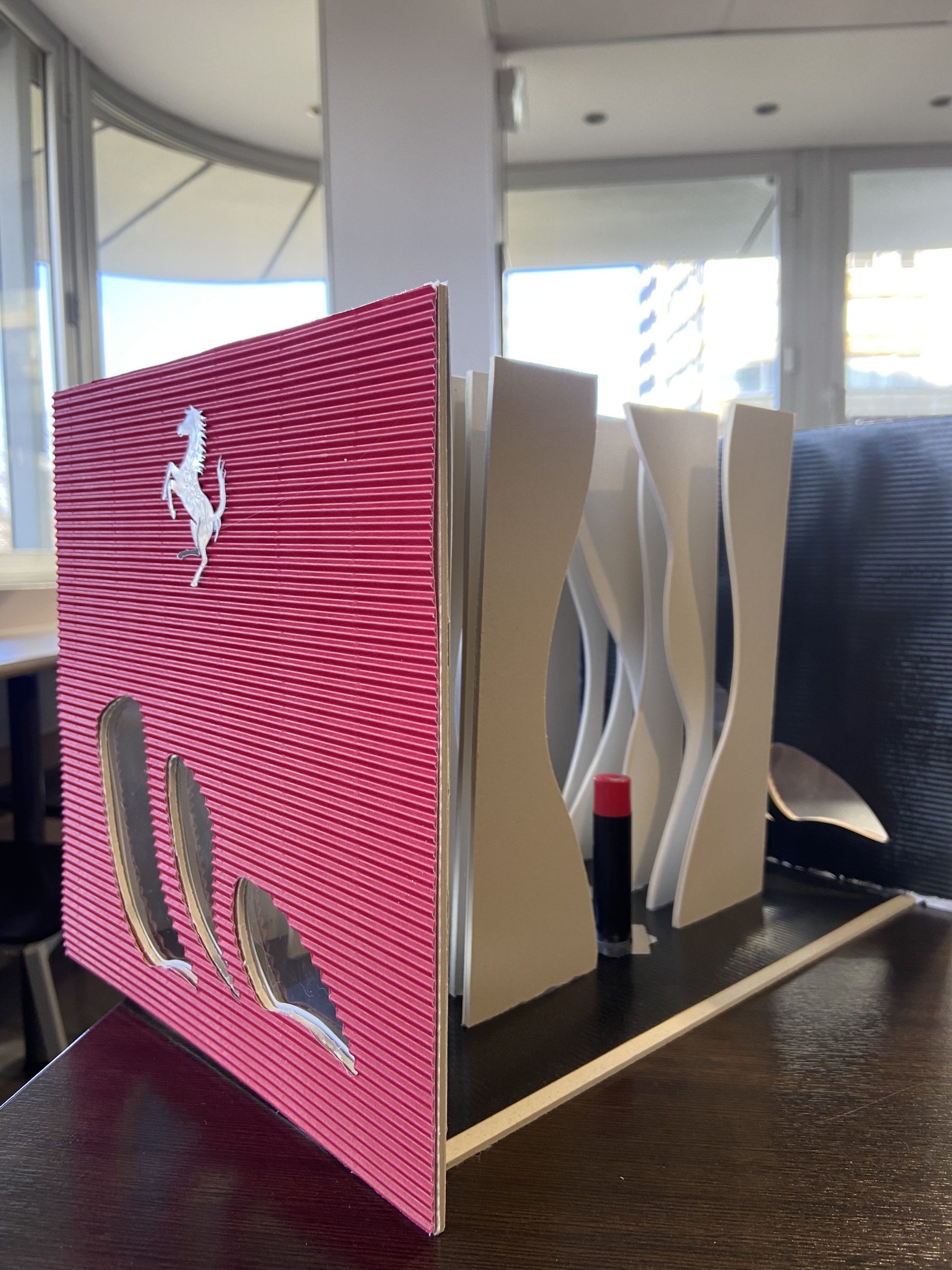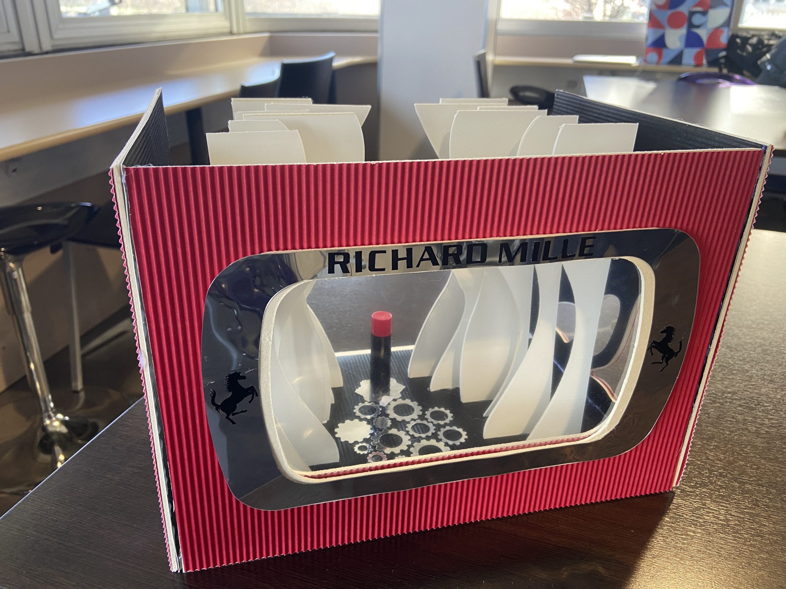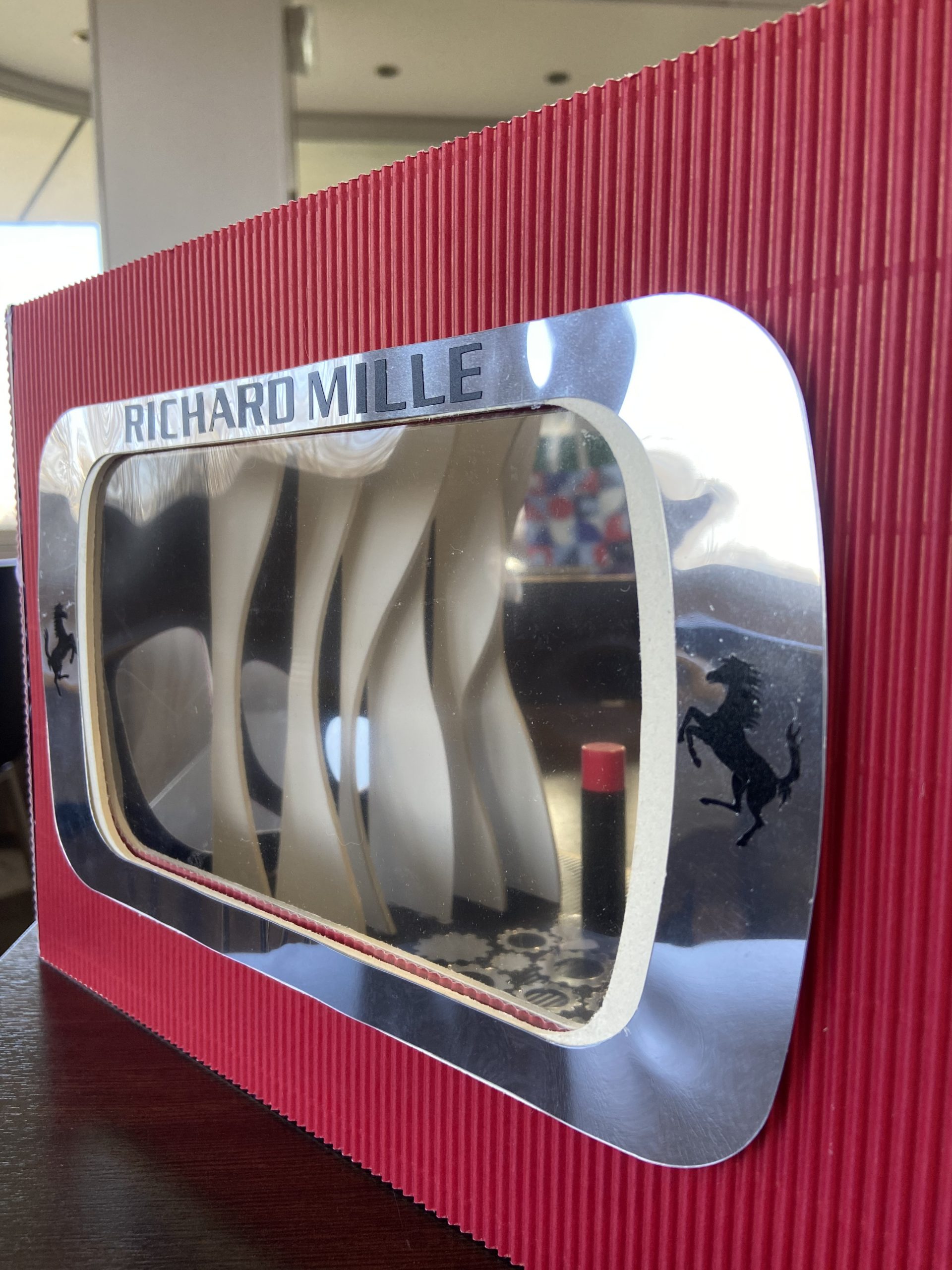 Cette maquette est parsemée de subtils hommages aux produits distinctifs des deux prestigieuses marques, notamment à travers les vitres latérales qui évoquent les grilles d’aération d’une Ferrari, ainsi que la vitrine principale qui adopte les contours caractéristiques d’une montre Richard Mille.